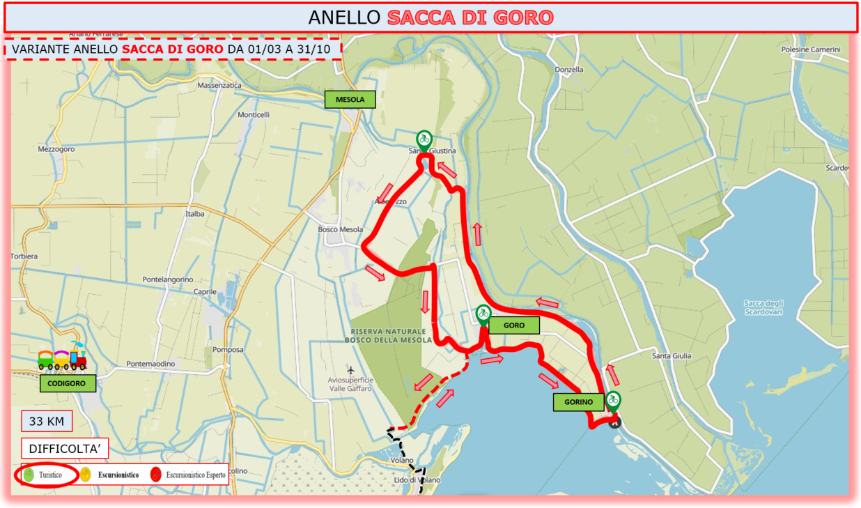 Punti d'interesse: Abbazia di Pomposa, Pineta di Bosco Mesola, Bunker di Mesola, Mesola, Ciclabile destra Po, Taglio di Po, Porto Tolle, Ca' Venier, Ciclabile sinistra Po, Porto Levante, Scanarello, Boccasette, Polesine Camerini, Scardovari, Barricata, Santa Giulia, Bacucco, Gorino, Argine Belvedere, Goro, Bosco della Mesola, Taglio della Falce